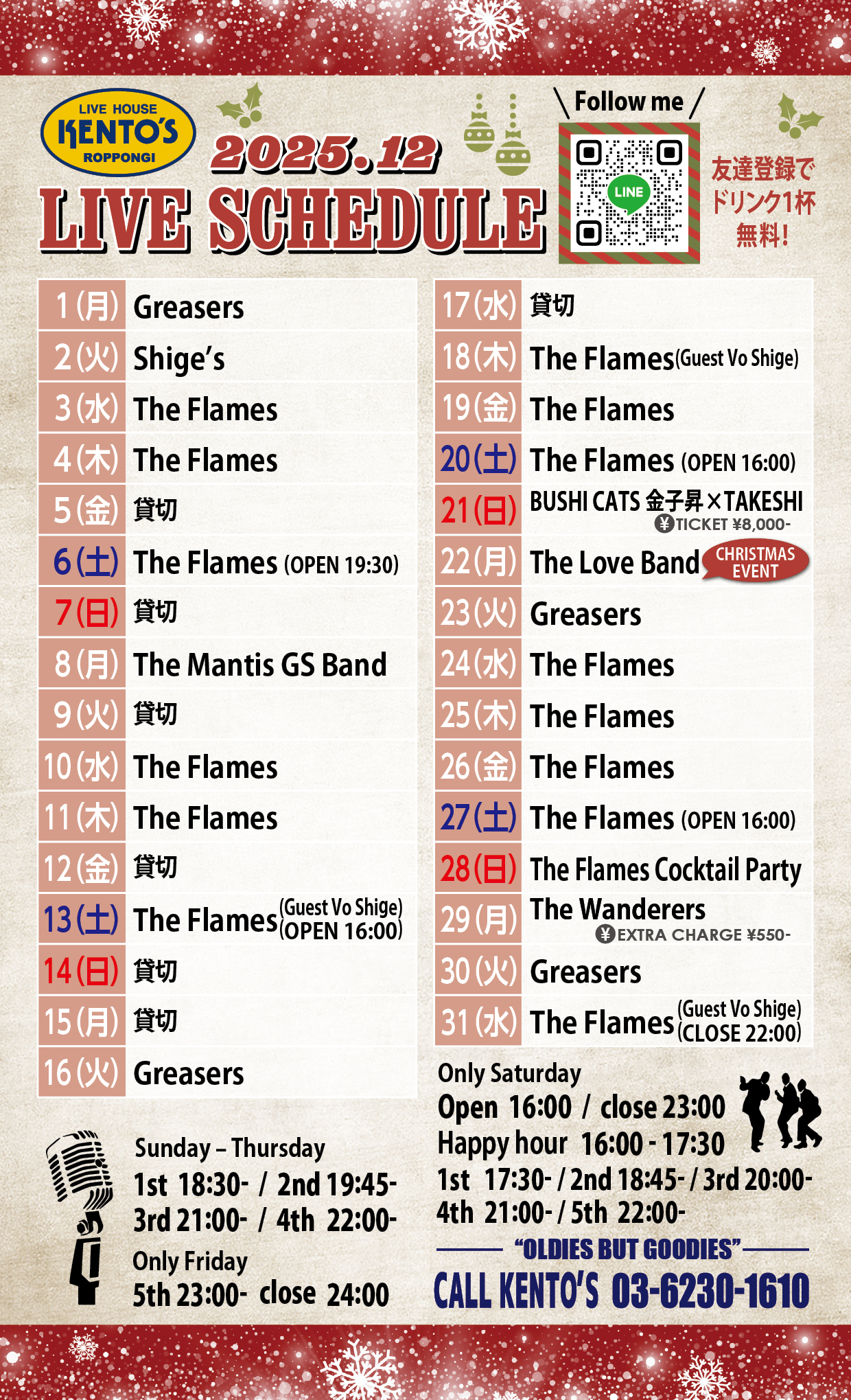 12月スケジュール 2025.11.12 Schedule 12月のPOPが完成しました! 28日はフレイムスのカクテルパーティーがあります。 六本木ケントスで一緒に盛り上がりましょう! 皆さまのご来店、心よりお待ちしております♪ ご予約はコチラ Special cocktail | 11月 前の記事 Special cocktail | 12月 次の記事